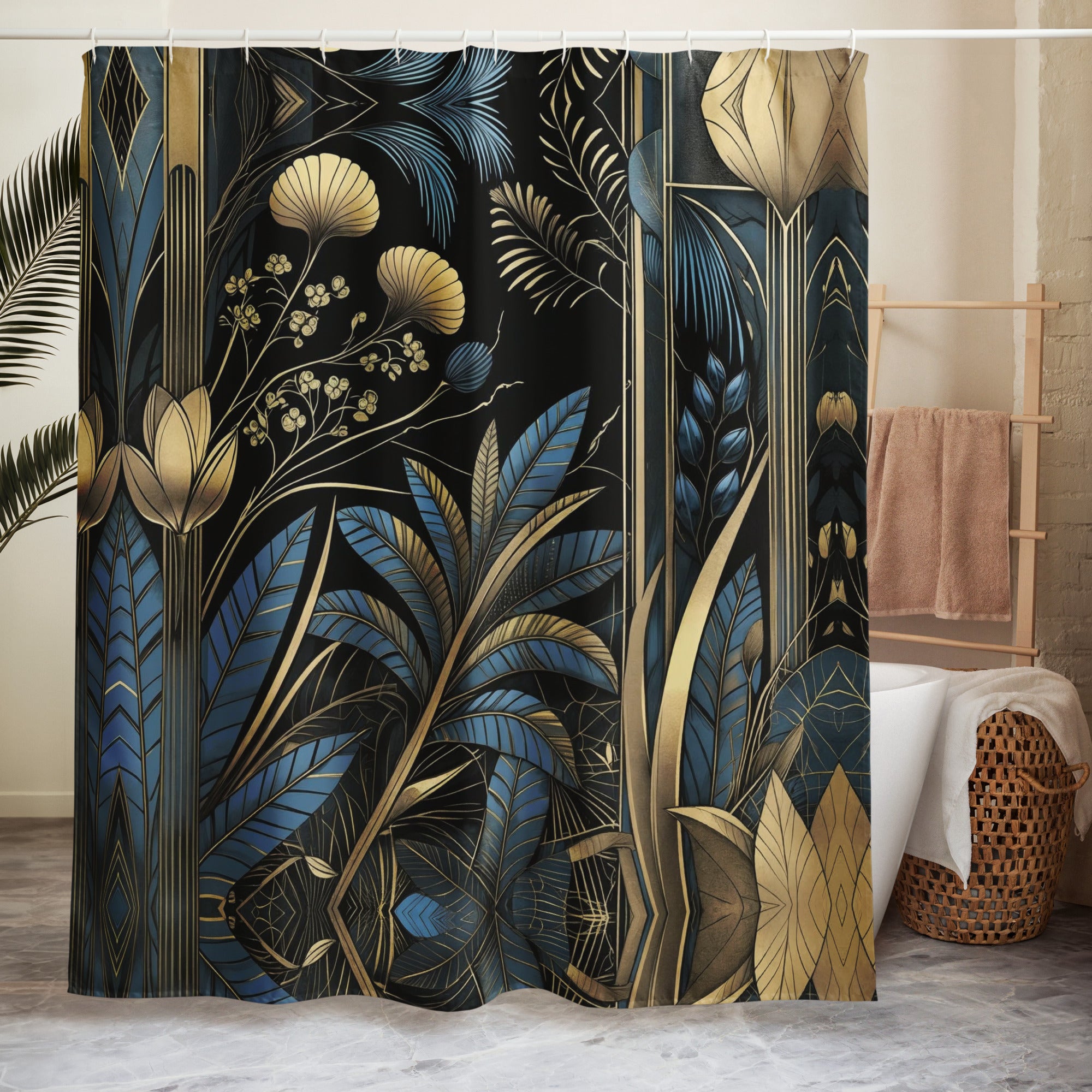 This isn't just a shower curtain—it's the centerpiece that transforms your entire bathroom from functional to extraordinary. The Art Deco botanical shower curtain featuring moonlit palm leaves in navy blue, black, and luminous gold brings sophisticated elegance to your most personal space.