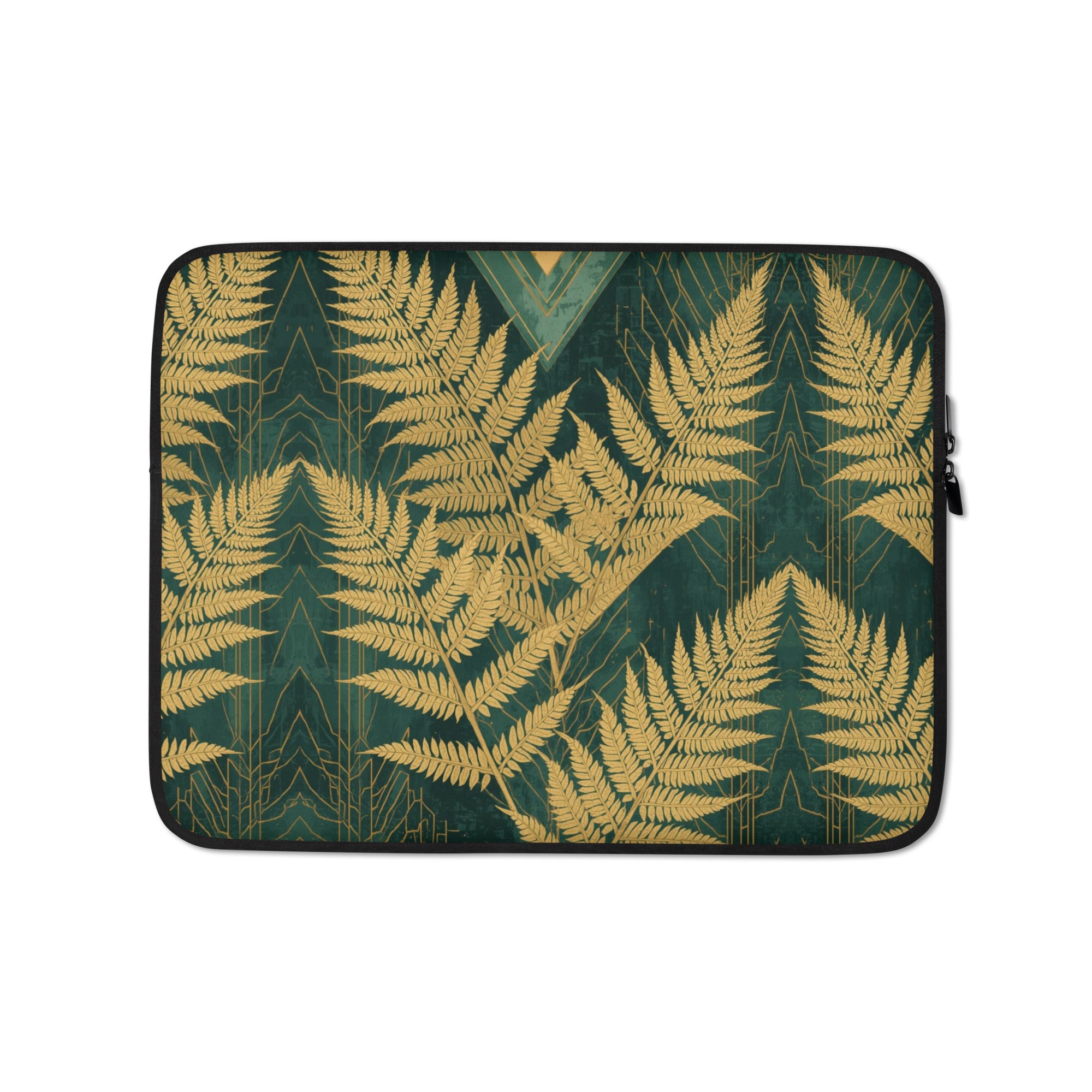 Carry your laptop like a work of art. This premium sleeve features a stunning nature-inspired fern design in rich gold on deep emerald green — a bold, luxurious statement for the woman who moves between boardrooms, cafés, and forest retreats with equal ease.