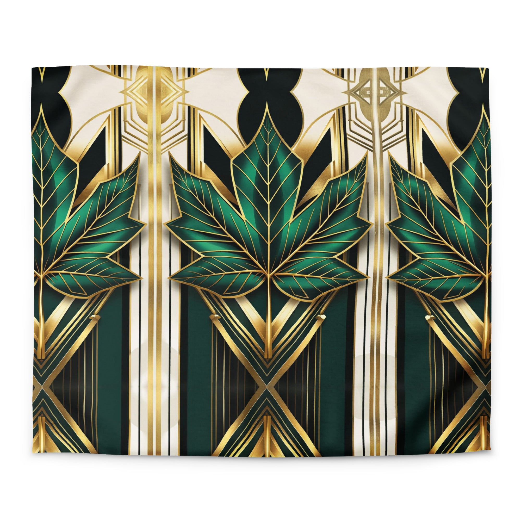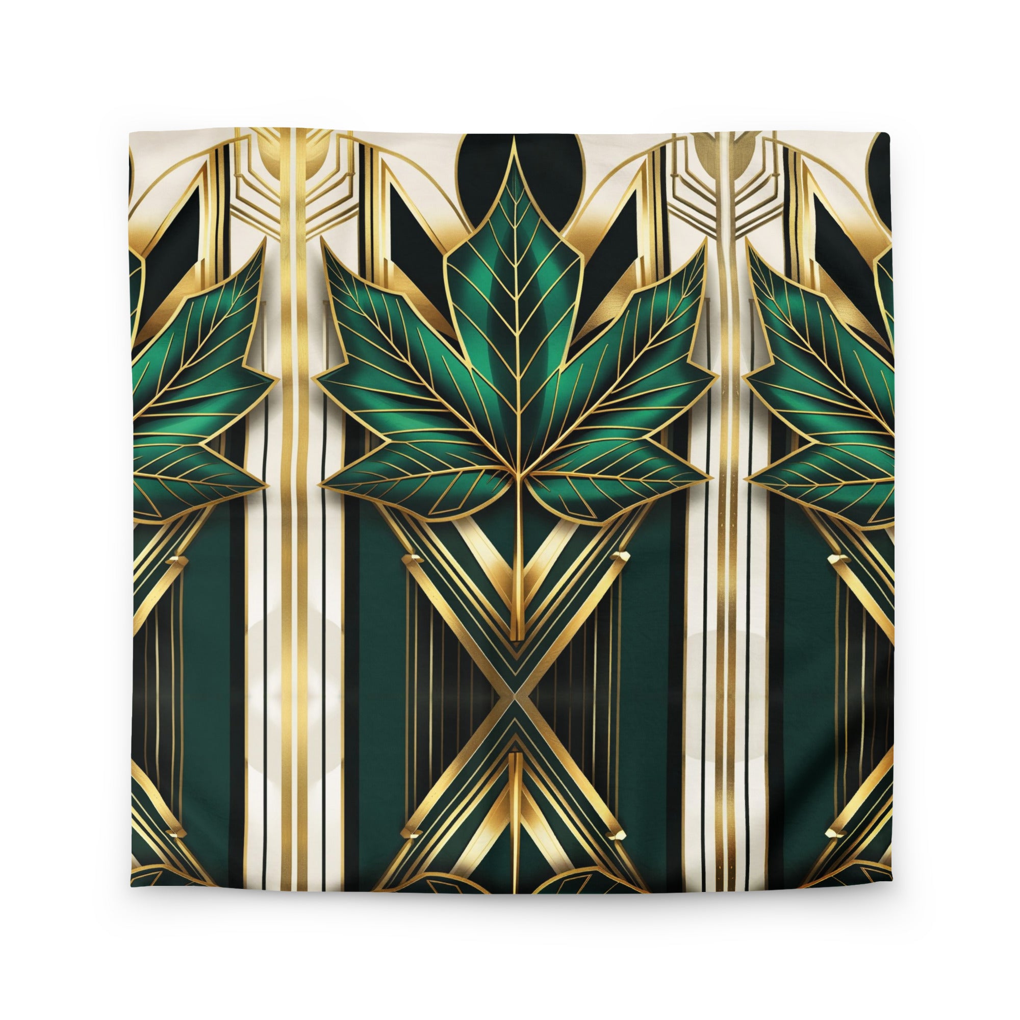 Transform your bedroom into a sanctuary of elegance with this stunning art deco duvet cover featuring the iconic Canadian maple leaf. The bold geometric pattern in emerald green, black, cream, and metallic gold brings mystical symbolism and luxurious style to your space.