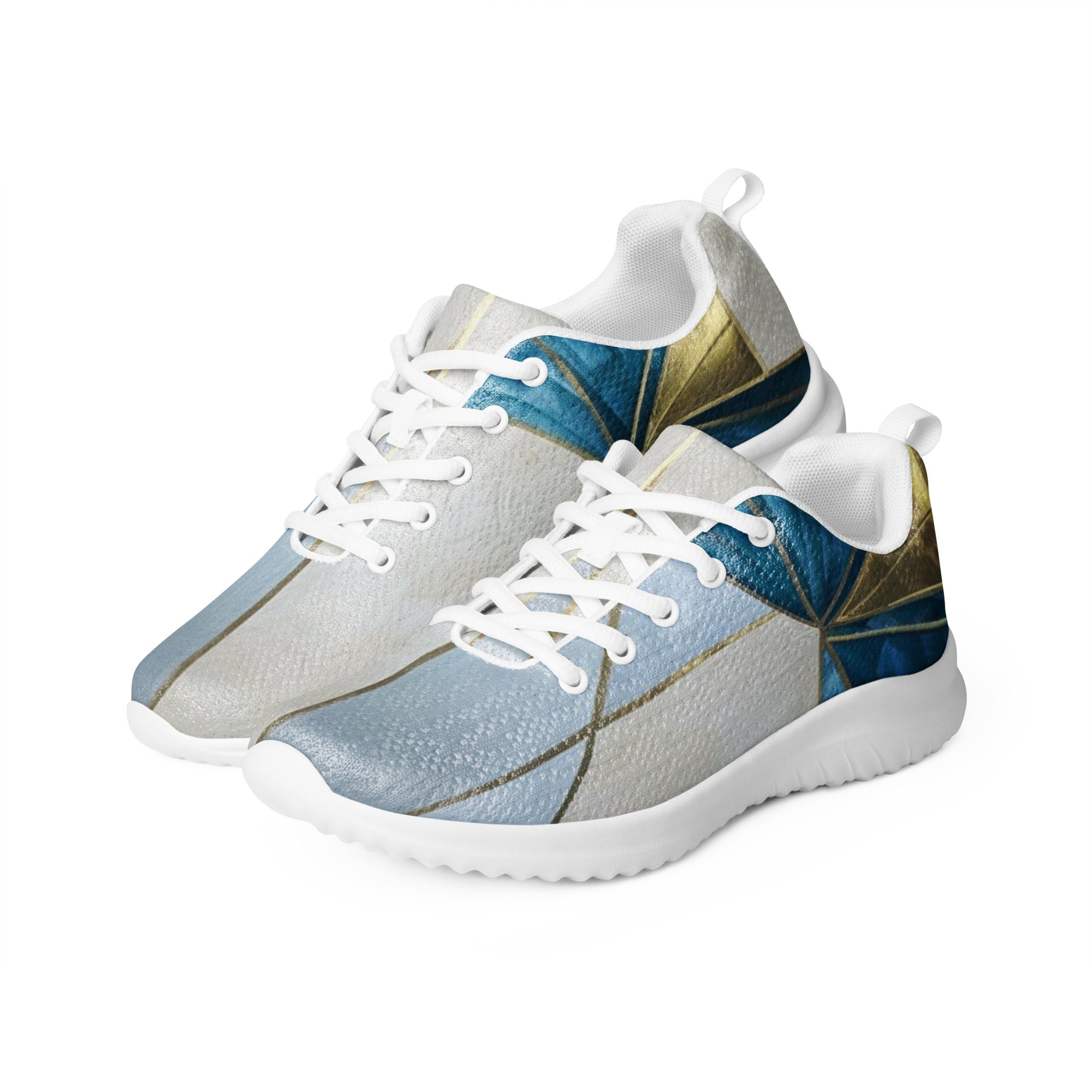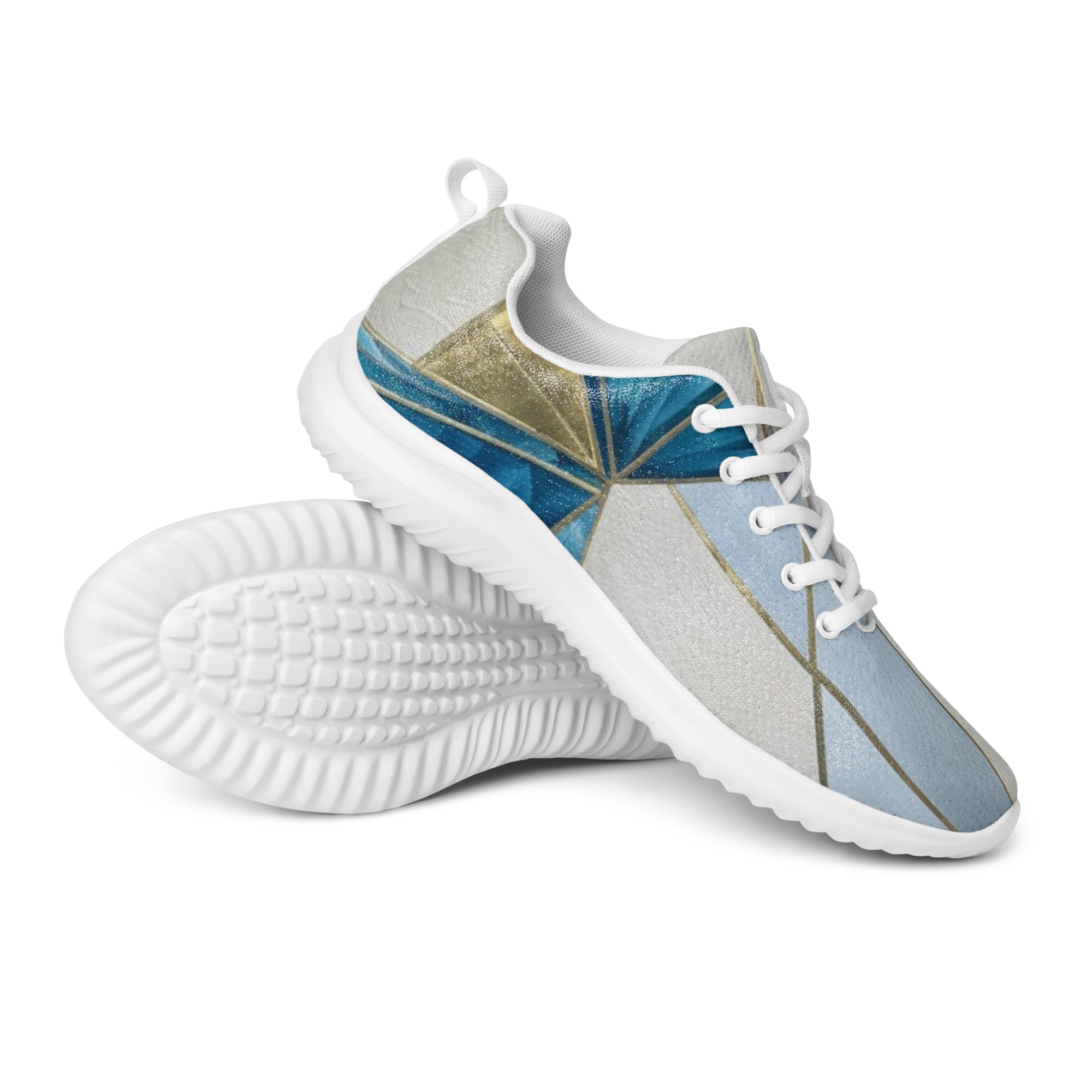 The geometric pattern on these athletic shoes captures the essence of exploration—deep teal waves meeting light blue skies, connected by golden rays that symbolize the journey between earth and horizon. Each angular shape represents direction, each color a different element of your path. This isn't just footwear—it's a compass you wear, guiding every step with intention and style.